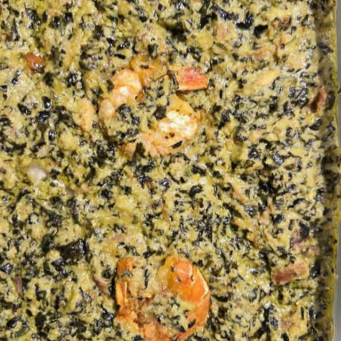 Butterleaf stew in a rich peanut sauce with shrimp, a classic Cameroonian specialty.