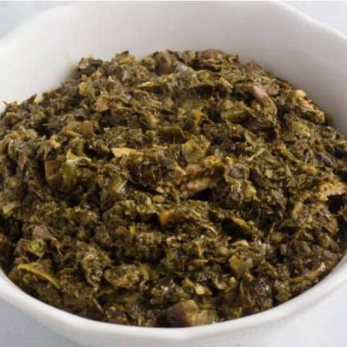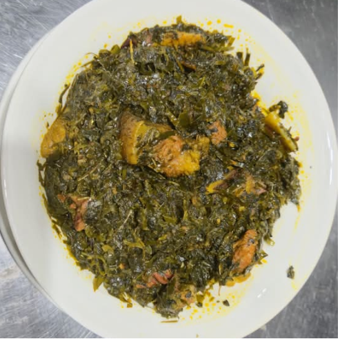Leafy eru stew cooked in palm oil with tender meat pieces for a rich, savory dish